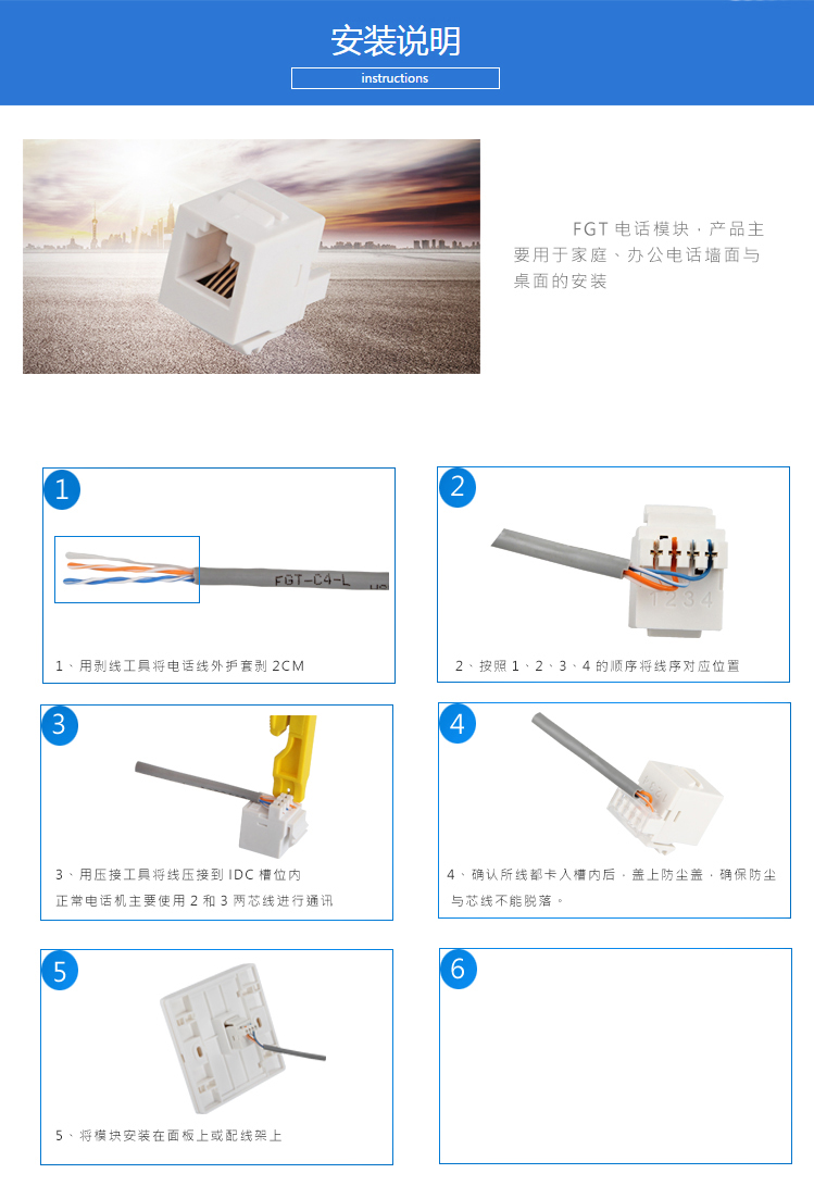 4芯電話模塊采用IDC打線壓接式安裝,用于各種電話線端接,方便快捷。執(zhí)行標(biāo)準(zhǔn):YD/T 926.3。