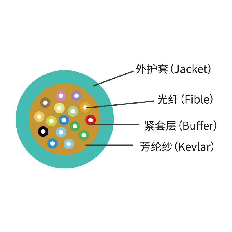 結構:緊套光纖由光纖涂覆層表面緊套一層或多層被覆層構成,便于剝離使用,光纜套管內置多股芳綸加強構件、具有良好的機械保護性能和抗拉力