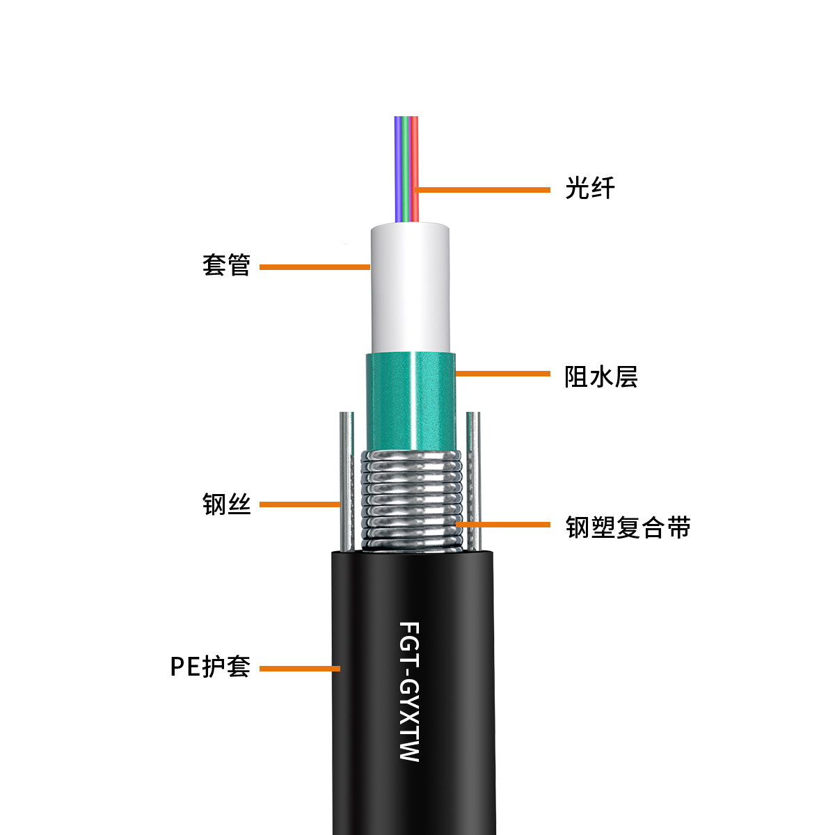金屬加強構件夾帶鋼絲的鋼——聚乙烯結護套中心束管式全填充型通信用室外光纜。